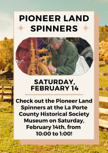 On February 14th, from 10:00 am – 1:00 pm, the spinners from Pioneer Land will be spinning yarn from natural fibers at the Museum just like the pioneers did.